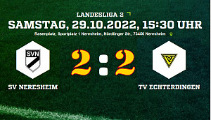 Beim Fünftplatzierten SV Neresheim kam der TV Echterdingen zu einem 2:2 (2:1). Bereits in der 6.Minute musste der TVE den ersten Gegentreffer durch Hakki Yildis hinnehmen. Doch es kam noch schlimmer – 23.Minute 2:0 für die Hausherren, Torschütze Ousman Bojang. Doch die Gelb-Schwarzen steckten nicht auf und kamen noch in der 1.Halbzeit zum Anschlusstreffer – Nils Große-Scharmann verkürzte auf 2:1 (32.). Zwei Wechsel des TVE - 46.Minute Alexander Schmidt für David Frenzel Medina und 54.Minute Ugur Yilmaz für Caglar Celiktas brachten neuen Schwung und auch den Ausgleich durch Rui Tiago zum 2:2 (58.).