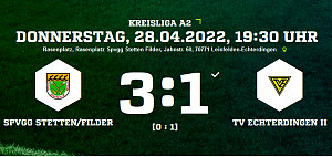 Die Serie ist leider gerissen... Derby in Stetten, unser Team konnte heute leider nicht die Leistung der vergangenen Wochen abrufen. Wir hatten zwar die erste Chance, doch Stetten kämpfte sich in die Partie und hatte ebenfalls gute Torchancen. Uns fehlte die Lockerheit sowie die Bewegung ohne Ball. Defensiv war es in der ersten Halbzeit noch ordentlich, offensiv kamen wir leider nicht in unser Kombinationsspiel. Leider trifft es uns aktuell hart und Mischa musste nach 30 Minuten verletzt vom Platz. Trotzdem erzielten wir durch Lenni die 0:1 Führung. Dies gab etwas mehr Sicherheit und kurz vor der Pause hatten wir die Doppelchance zum 0:2. In der 2. Halbzeit sind wir leider sehr früh in einen Konter gelaufen und hier erzielte Stetten etwas glücklich das 1:1. Stetten konterte sehr gut und wir waren in der Defensive nicht mehr so stabil. So erzielte Stetten zwei weitere Kontertore. Unser Team hat sich nicht aufgegeben und kämpfte sich wieder in die Partie. Eban hatte 10 Minuten vor Schluss die Großchance zum Anschlusstreffer. Am Ende ein nicht unverdienter Sieg von Stetten.