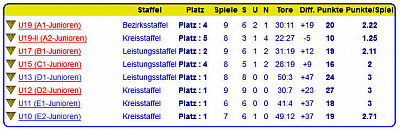 Die Rückrunde der Junioren wurd am vergangenen Wochenende beendet. Besonders erfreulich dabei, alle unteren 4 Junioren-Teams (U10, U11, U12 und U13) wurden Meister in ihren Staffeln. Die U13 steigt dabei sogar in die Bezirksstaffel auf. Etwas unglücklicher verlief die Saison dabei für die U19 und die U17 - beide verpassten am letzten Spieltag den Sprung auf den Sonnenplatz - die U19 trennte sich dabei vom MTV Stuttgart mit 1:1 und belegte dabei in einer ausgeglichenen Staffel den 4.Tabellenplatz. Die U17 unterlag gar am letzten Spieltag dem MTV Stuttgart II mit 0:2 und rutschte dadurch noch hinter den TSV Bernhausen. Die U15 könnte am kommenden Mittwoch noch im Nachholspiel gegen den Tabellenzweiten SV Sillenbuch II sowohl mit dem TSVgg Plattenhardt, als auch mit dem SV Sillenbuch II punktemäßig gleichziehen (allerdings hat der FV Germania Degerloch bei einem Spiel weniger die beste Ausgangslage).