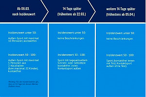 "Nach dem gestrigen Beschluss der Ministerpräsidenten-Konferenz, den Lockdown bis mindestens 18. April 2021 zu verlängern, gibt es keine weiteren Lockerungen wie im vierten Öffnungsschritt des Stufenplanes zunächst vorgesehen. Für den Sport bedeutet dies, dass bis auf Weiteres die seit dem 8. März gültigen