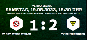 Im 1.Saisonspiel in der Verbandsliga siegt der TV Echterdingen beim FV Rot-Weiss Weiler mit 1:2 (1:0) und startet so mit einem Erfolg in die neue Runde. In einer eher ereignisarmen 1.Halbzeit gelang dem Gastgeber in der 16.Minute die Führung - Coutinho da Silva netzte zum 1:0 für die Hausherren ein. Nach dem Wechsel verstärkte der TVE seine Bemühungen und kam in der 75.Minute durch Neuzugang Steffen Schmidt mit einem 25-Meter-Hammer zum 1:1 Ausgleich. In der 86.Minute brachte Michael Deutsche den TVE dann auf die Siegerstrasse - mit einem Heber überwindet er den Weiler Schlussmann zum 1:2.