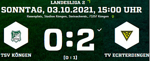 Der TV Echterdingen erklimpt die Tabellenspitze - durch einen 2:0-Sieg beim TSV Köngen. Nachdem sich der bisherige Tabellenführer SC Geislingen bereits am vergangenen Freitag mit einem 1:1 begnügen musste, liegt der TVE nun mit 1 Punkt Vorsprung auf dem 1.Tabellenplatz. Caglar Celiktas brachte den TVE in der 19.Minute mit 1:0 in Front, die Entscheidung dann durch den eingewechselten Aron Zogaj (90.) zum 2:0.