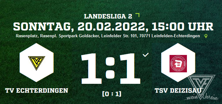Nach der Winterpause kommt der TV Echterdingen im Heimspiel gegen den TSV Deizisau nicht über ein 1:1 (0:1) hinaus. Nach mehreren Torchancen in der 1.Halbzeit kassiert der TVE in 28.Minute dennoch den Gegentreffer - ein langer Ball zeigte Lücken im TVE-Verbund auf und diese nutzte das Tabellenkind Deizisau zur 0:1-Führung. Nach der Pause verstärkte der TVE sein bemühen - welches letztlich auch im Ausgleich durch Caglar Celikats in der 52.Minute zum 1:1 resultierte. Doch in der Folgezeit konnte der TVE aus seiner optischen Überlegenheit nicht profitieren - Chancen durch Celikats und Rui blieben ohne zählbares. Der überwiegend passive Gast hatte aber durchaus auch Hochkaräter (67./74.) auf ihrer Seite. Letztlich mussten sich beide Kontrahenten mit diesem Ergebnis zufrieden geben,