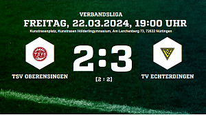Der TV Echterdingen schwebt weiter auf der Welle des Optimimus, auch im 4x Spiel nach der Winterpause bleibt der TVE schadlos - mit einem 2:3 beim Auswärtsspiel in Oberensingen klettert der TVE weiter in der Abstiegszone nach oben und überflügelt den Kontrahenten aus Oberensingen um 2 Punkte. Nachdem beide Teams mit jeweils 2 Toren in die Halbzeit gingen - 0:1 Celiktas (10.) , 1:1 Bosler (11.), 2:1 Kögler (43.) und 2:2 (47.) Todorovic - konnte Anes Handanagic 85.Minute den viel umjubelten 2:3 Siegtreffer markieren. Mit nun 10 Punkten aus 4 Partien kommt das Ziel Klassenerhalt durchaus in Reichweite.