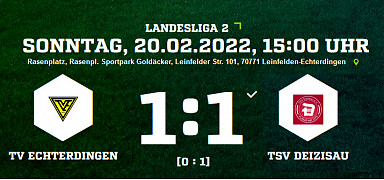 Nach der Winterpause kommt der TV Echterdingen im Heimspiel gegen den TSV Deizisau nicht über ein 1:1 (0:1) hinaus. Nach mehreren Torchancen in der 1.Halbzeit kassiert der TVE in 28.Minute dennoch den Gegentreffer - ein langer Ball zeigte Lücken im TVE-Verbund auf und diese nutzte das Tabellenkind Deizisau zur 0:1-Führung. Nach der Pause verstärkte der TVE sein bemühen - welches letztlich auch im Ausgleich durch Caglar Celikats in der 52.Minute zum 1:1 resultierte. Doch in der Folgezeit konnte der TVE aus seiner optischen Überlegenheit nicht profitieren - Chancen durch Celikats und Rui blieben ohne zählbares. Der überwiegend passive Gast hatte aber durchaus auch Hochkaräter (67./74.) auf ihrer Seite. Letztlich mussten sich beide Kontrahenten mit diesem Ergebnis zufrieden geben,