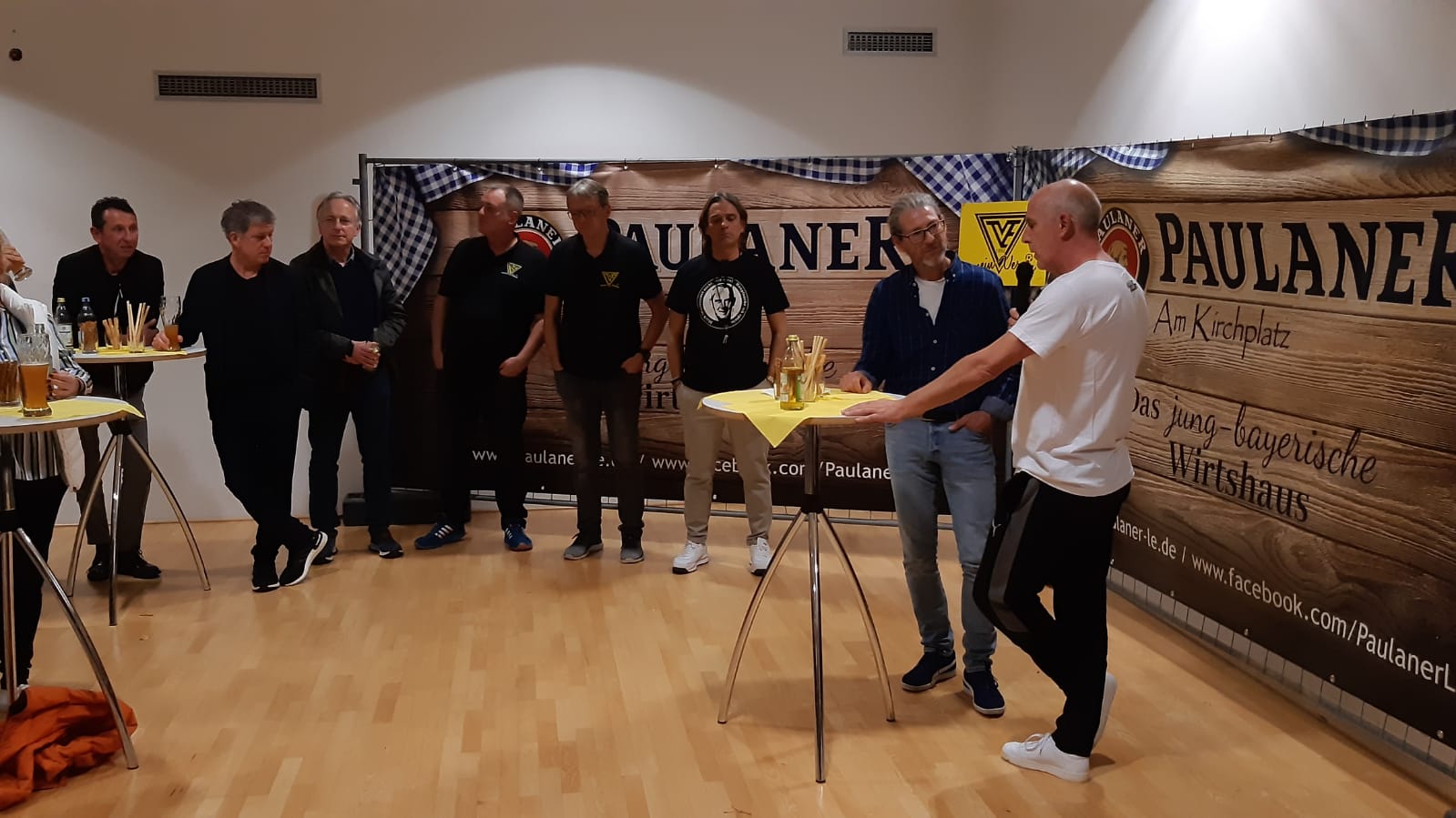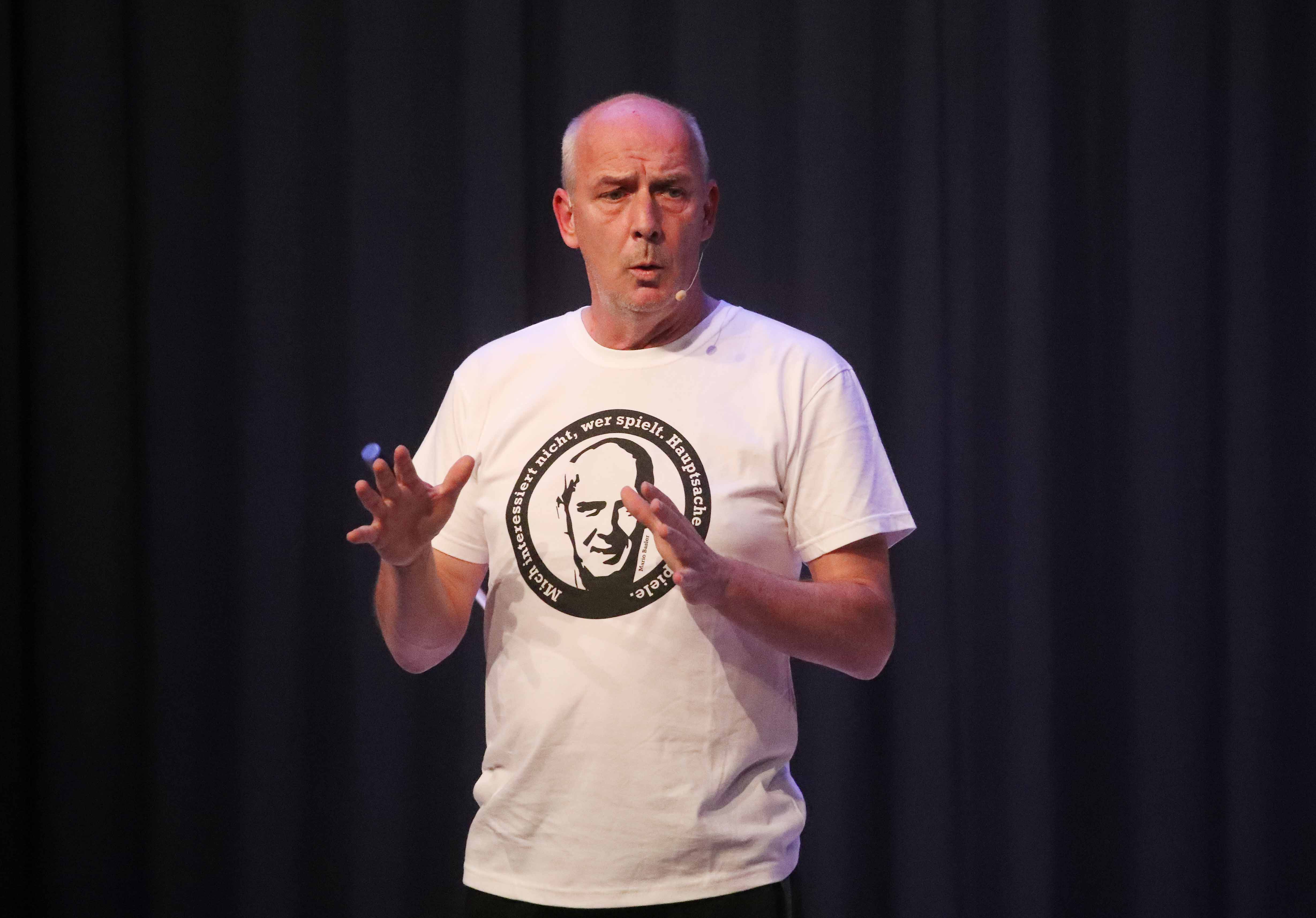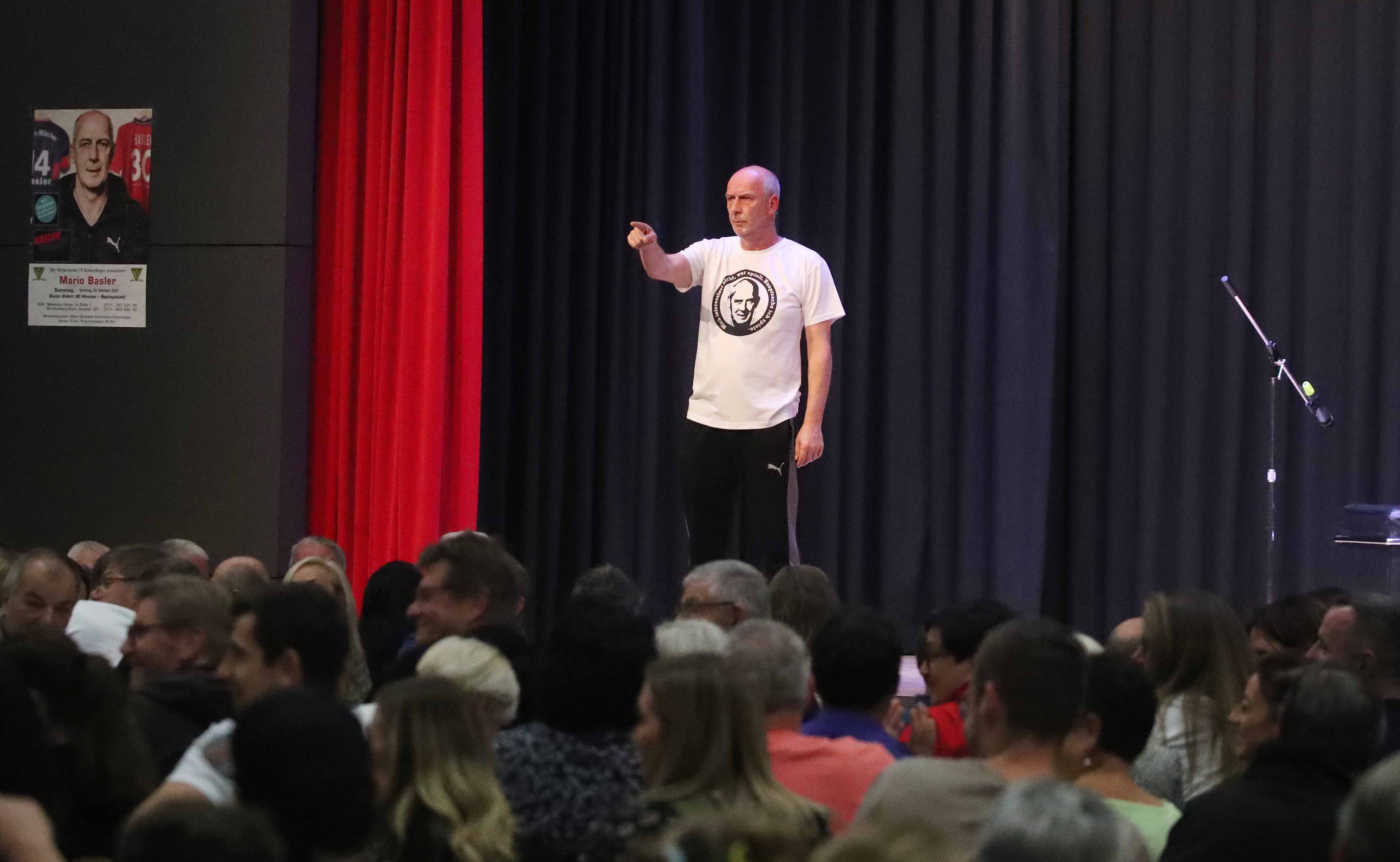 Ja, man kann es wirklich sagen, ein unvergesslicher Abend liegt hinter uns! Mario Basler zeigte sich authentisch, entspannt und trotz 540 km Anreise aus Osnabrück sehr locker. Super-Mario, der sich während seines über 90-Minuten Vortrags völlig unbescheiden zeigte, servierte Stories von Otto Rehagel, Uli Borofka und auch Thorsten Legat fand in seinen unterhaltsamen Erzählungen Erwähnung. Insgesamt eine kurzweilige Darbietung, die alle Gäste, ob Basler-Fans oder nicht, mehr als zufrieden stellte. Der Sportredakteur und Ex-TVE´ ler Jürgen Kemmner interviewte Mario anschließend in unserer Paulaner-Lounge und hier offenbarte Mario vor den begeisterten TVE-VIP-Gästen noch einige Geheimnisse. So liegt die Schmerzgrenze für die Teilnahme am RTL-Dschungel-Camp bei ca. 1 Mio. Euro und ein Fan des Damenfußballs ist Basler eher nicht. Nach dem sehr kurzweiligen Gespräch verabschiedete sich Mario Basler gegen 23 Uhr von der TVE-Familie und machte sich auf den Weg zurück nach Osnabrück, wo er am Sonntag um 14 Uhr sein türkisches Team im Heimspiel der Kreisliga Westfalen betreute und auch 4:1 gewann.