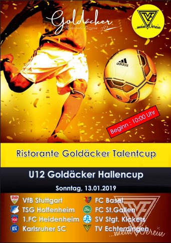 Zum Abschluss der Hallenturnierserie Winter 2018 / 2019 begrüsst die Jugendabteilung Fußball des TV Echterdingen am kommenden Sonntag, dem 13.01.2019 noch einmal hochkarätige Gäste in der Goldäckerhalle zum NLZ-U12  Ristorante Goldäcker Talentcup.
