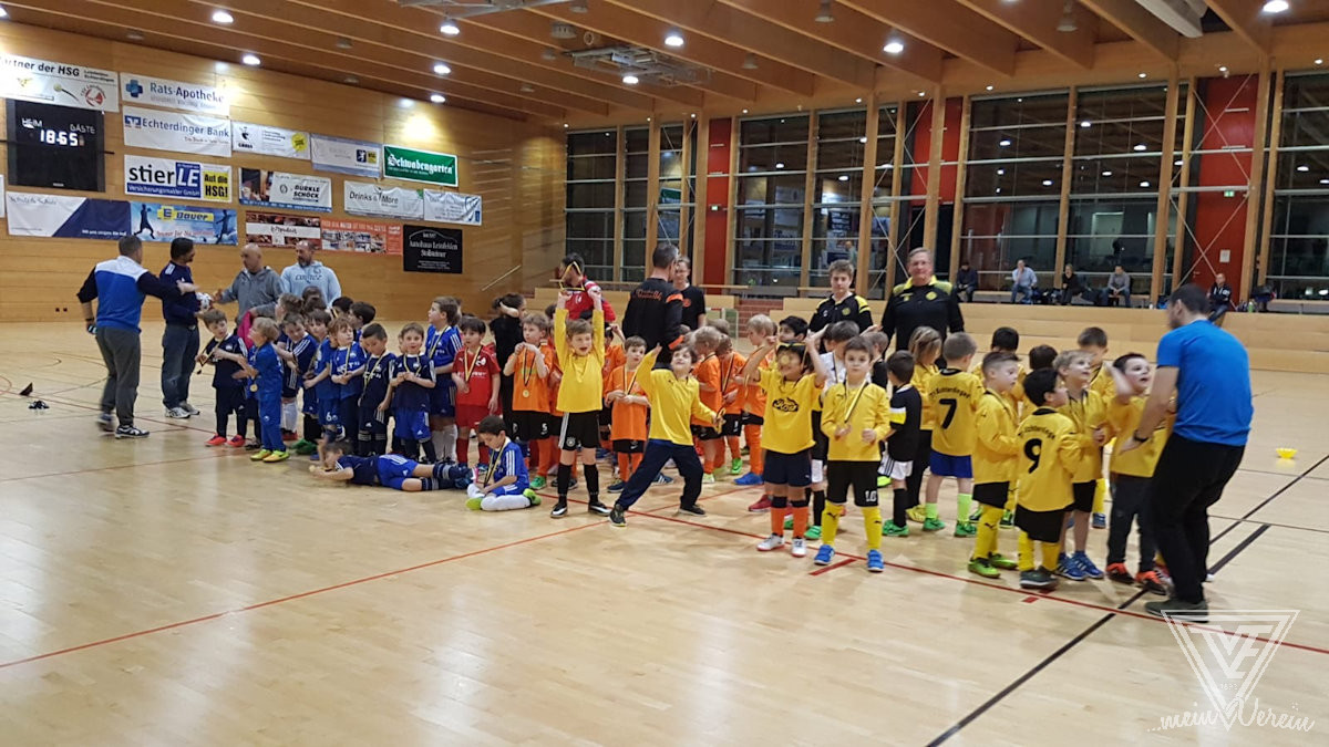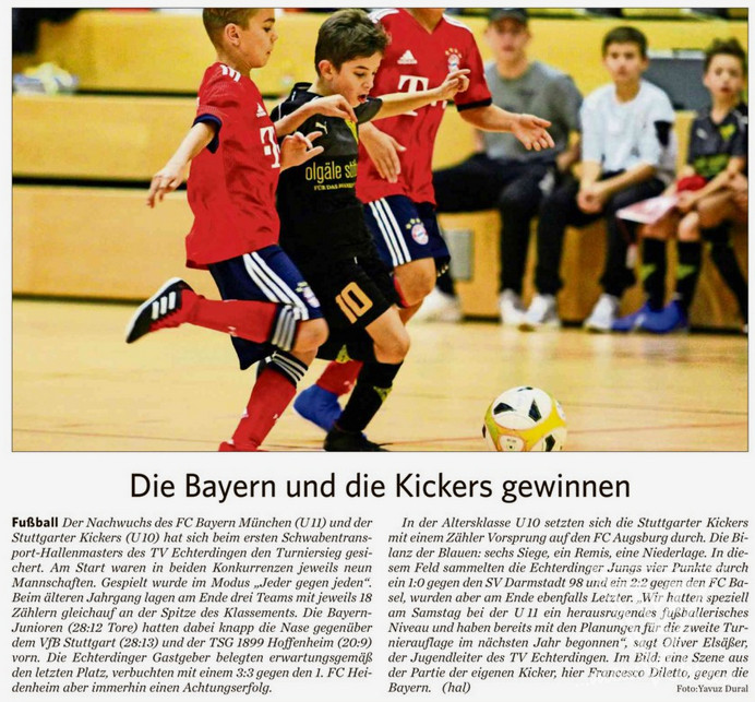 Hallenmasters des TV Echterdingen den Turniersieg gesichert. Am Start waren in beiden Konkurrenzen jeweils neun Mannschaften. Gespielt wurde im Modus „Jeder gegen jeden“. Beim älteren Jahrgang lagen am Ende drei Teams mit jeweils 18 Zählern gleichauf an der Spitze des Klassements. Die Bayern-Junioren (28:12 Tore) hatten dabei knapp die Nase gegenüber dem VfB Stuttgart (28:13) und der TSG 1899 Hoffenheim (20:9) vorn. Die Echterdinger Gastgeber belegten erwartungsgemäß den letzten Platz, verbuchten mit einem 3:3 gegen den 1. FC Heidenheim aber immerhin einen Achtungserfolg.
