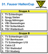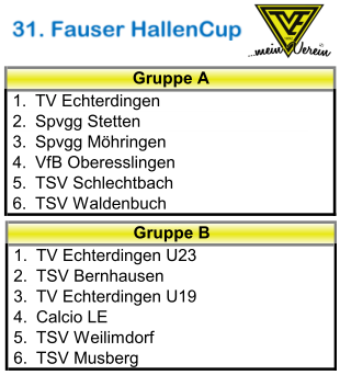 Angeführt wird das Teilnehmerfeld vom Verbandsligisten und Titelverteidiger Calcio Leinfelden-Echterdingen. Die Mannschaft von Trainer Francesco di Frisco konnte im letzten Jahr verdient den Fauser Wanderpokal durch einen 4:1 Finalsieg gegen den Veranstalter TV Echterdingen gewinnen. Neben dem Gastgeber TV Echterdingen mit ihrem neuen Trainer Christopher Eisenhardt sind aus der Landesliga auch der TSV Weilimdorf mit Trainer Daniel Goss am Start. Aus der Bezirksliga haben neben dem TSV Bernhausen mit Ihrem Trainer Peter Weinmann auch die Spvgg Möhringen mit unserem Ex-Trainer Karl-Heinz Fuhrmann ihren Anspruch auf den Wanderpokal angemeldet. Der TSV Waldenbuch kommt mit ihrem neuen Trainer Carmine Napolitano in die Goldäckerhalle. Komplettiert wird das Teilnehmerfeld durch die Teams aus ... [mehr]