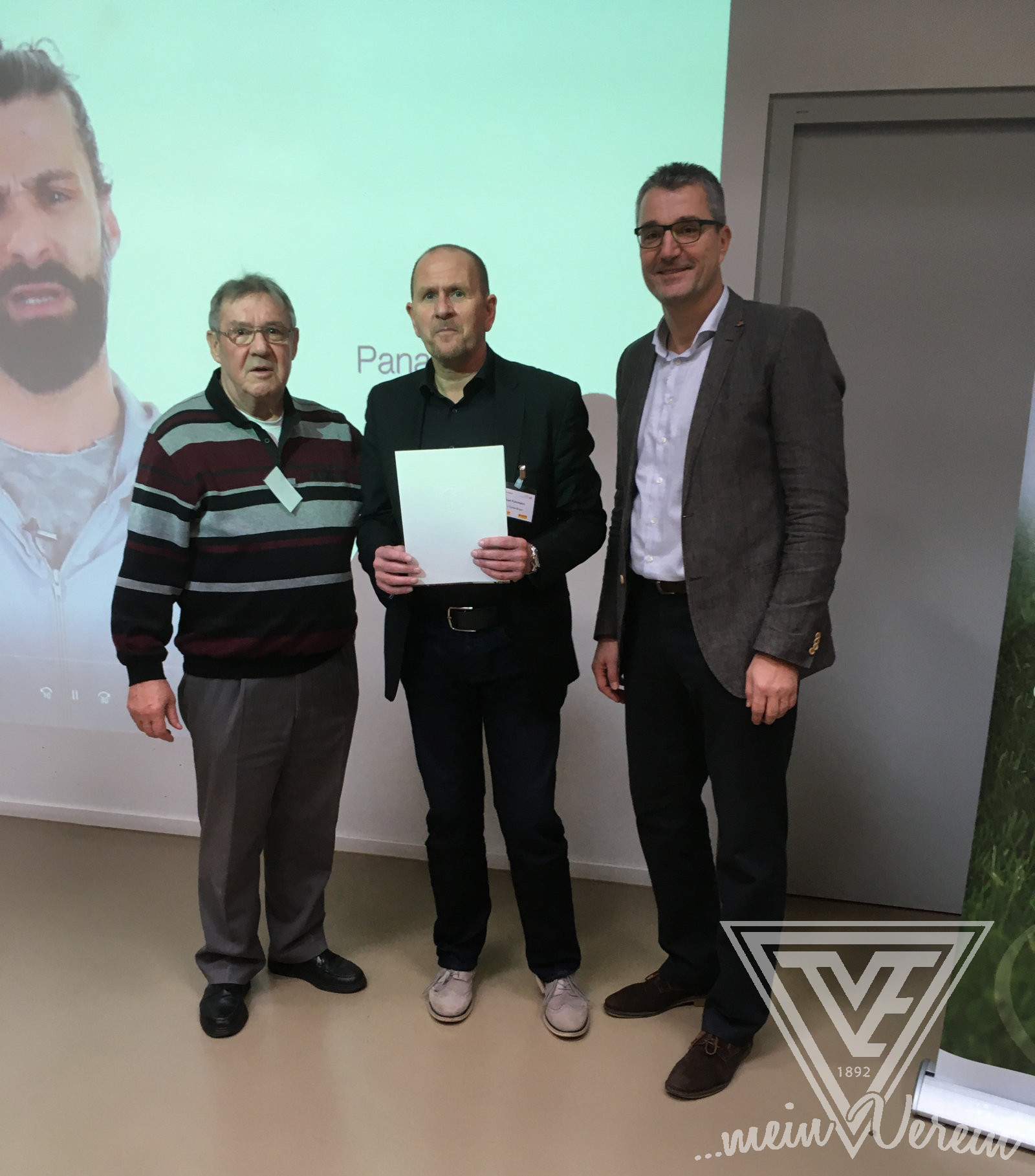 Auf dem Bild bei der Übergabe der Ehrenurkunde: Richard Sillmann (Ehrenamtsbeauftragter des TVE) , Kurt Fuhrmann und der ehemalige FIFA-Schiedsrichter Knut Kircher.