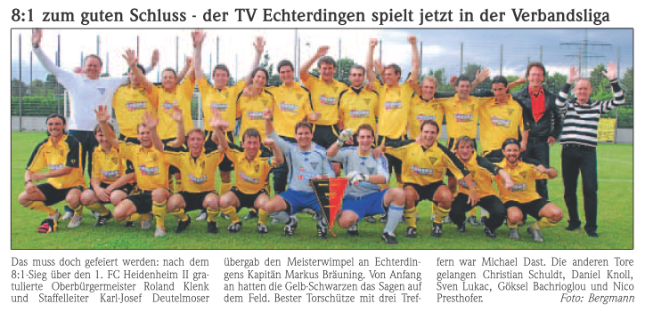 Nach einer überragenden Saison steigt der TV Echterdingen mit seiner 1.Mannschaft in die Verbandsliga auf. In der Abschlußtabelle hat der TVE dann gar 10 Punkte Vorsprung auf den Zweitplatzierten,